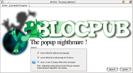 Le tueur de publicités et de popup intelligent ! BlocPub est un petit utilitaire qui permet de détruire les fenêtres publicitaires (popup) qui apparaissent lorsque vous surfez.