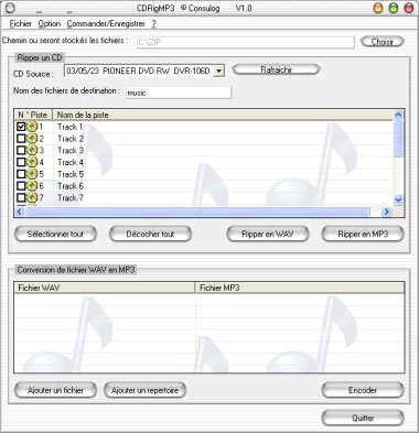 Copier un CD Audio au format WAV ou MP3 CDRipMP3 est un logiciel qui vous permet de copier un CD Audio au format WAV ou MP3. Il permet également de convertir directement un fichier WAV en format MP3